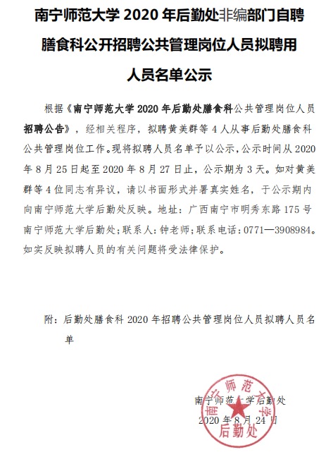 南宁师范大学2020年后勤处非编部门自聘膳食科公开招聘公共管理岗位人员拟聘用人员名单公示
