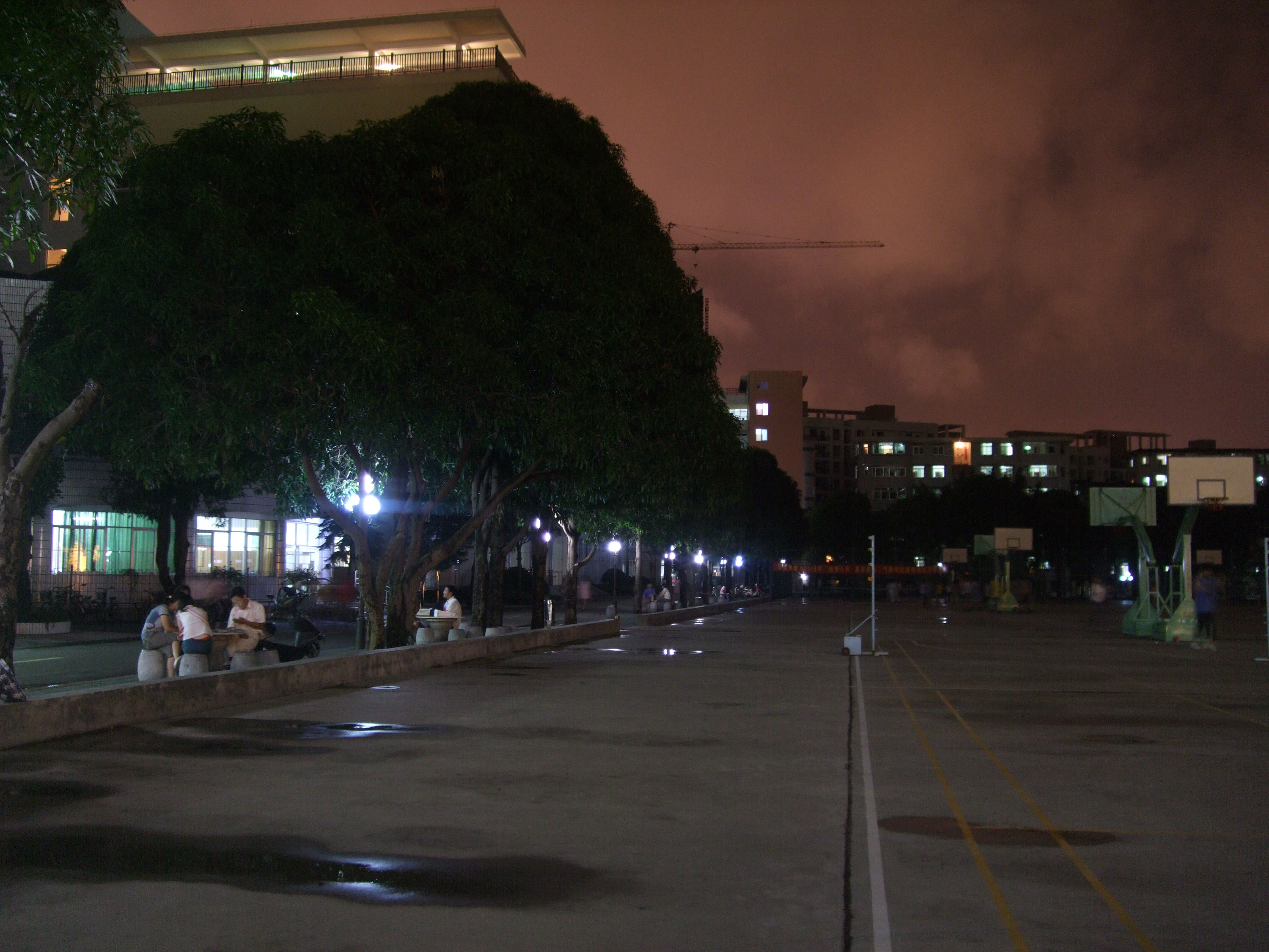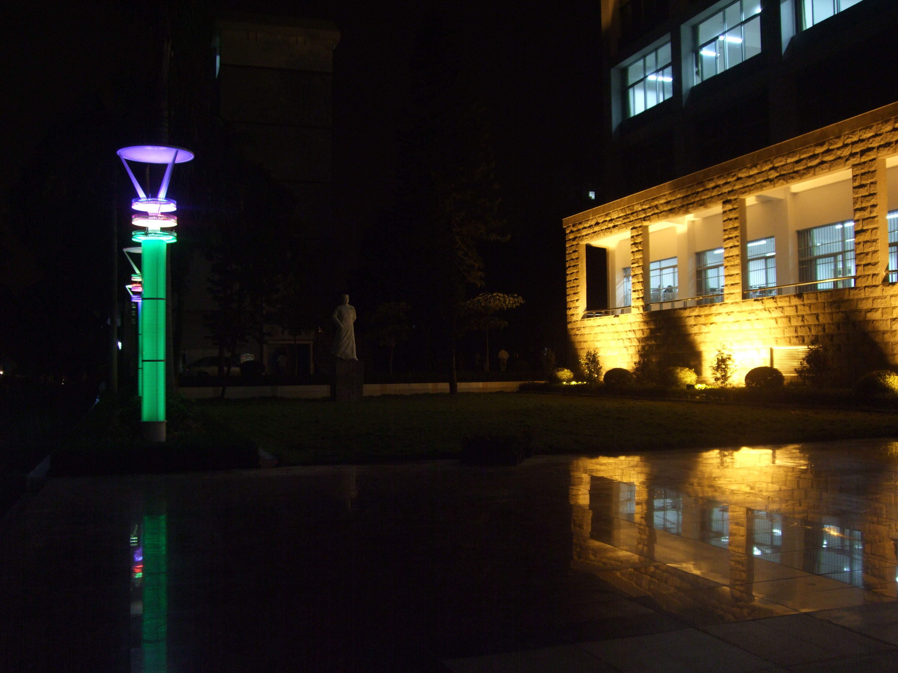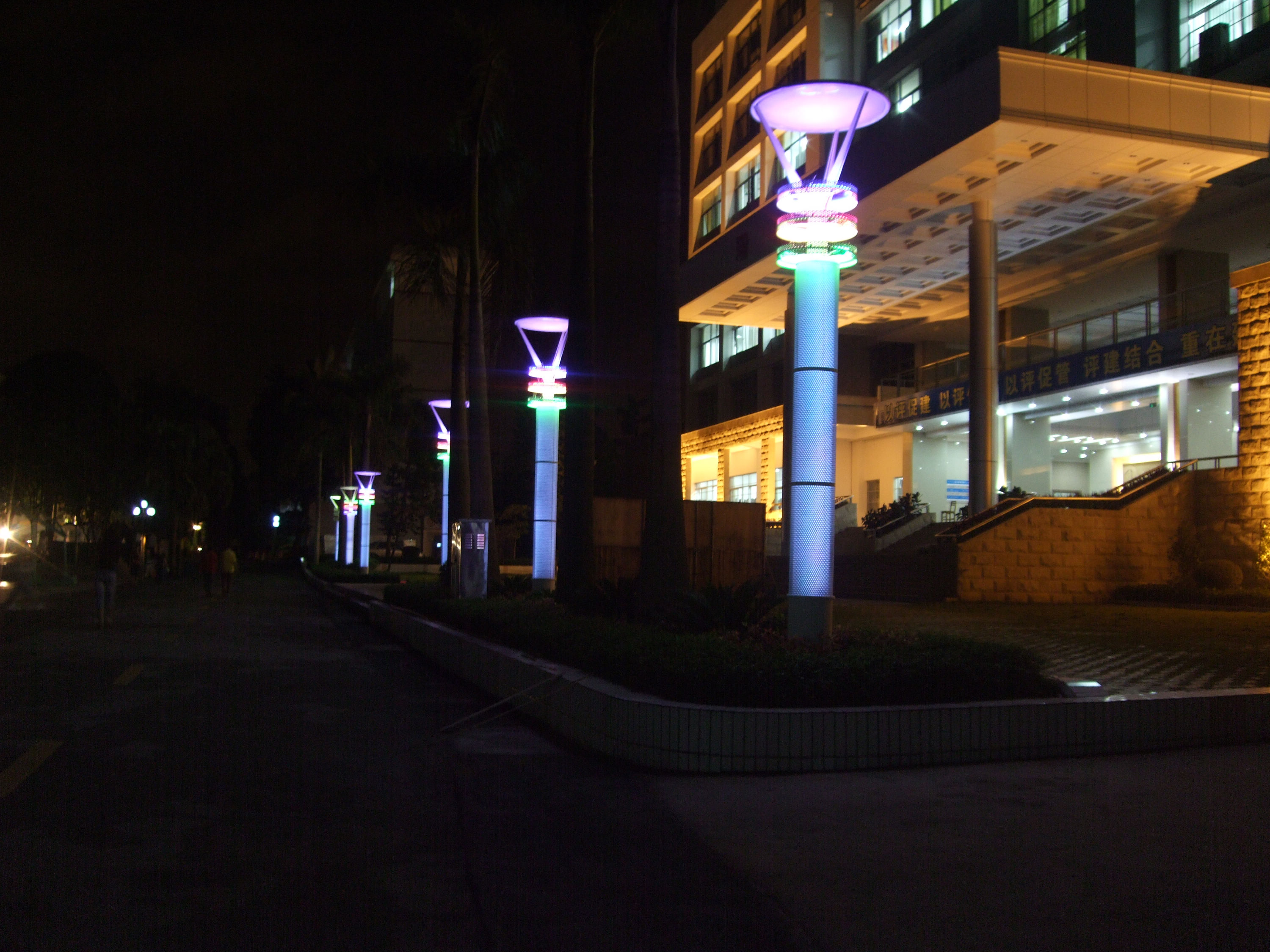 夜幕降临,校园中亮起盏盏路灯。篮球场边的林荫道,教学楼前的草丛旁,明亮的灯光静静地守候着路过的行人。这是由后勤处打造的亮化工程,为学生们校园生活增添一抹暖色。