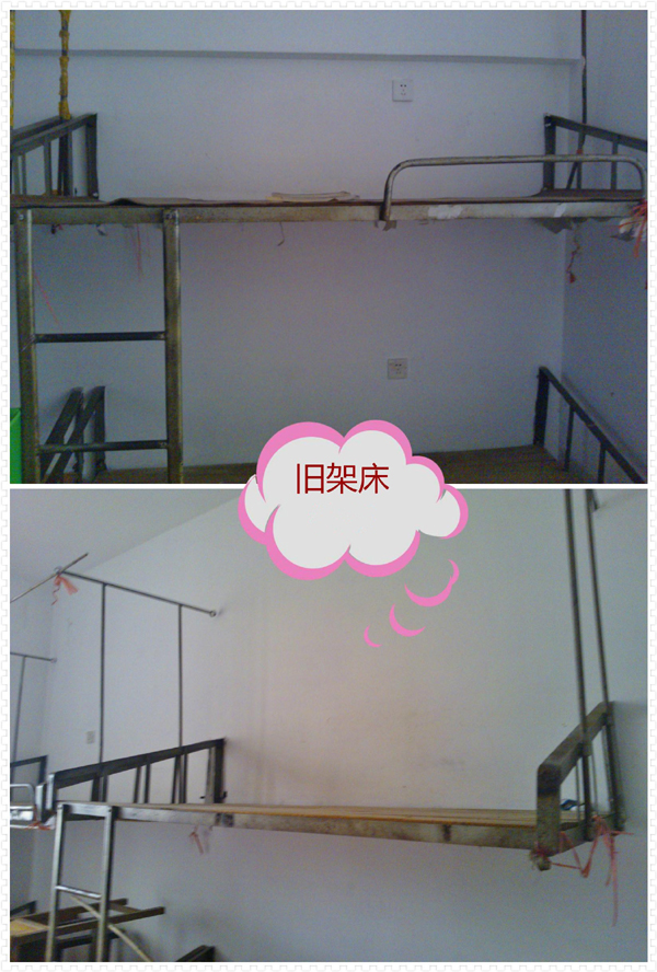 自2014年12月开始,后勤处利用周末跟寒假时间,对这几栋学生宿舍的旧架床进行更换,接替它们的是崭新的架床。