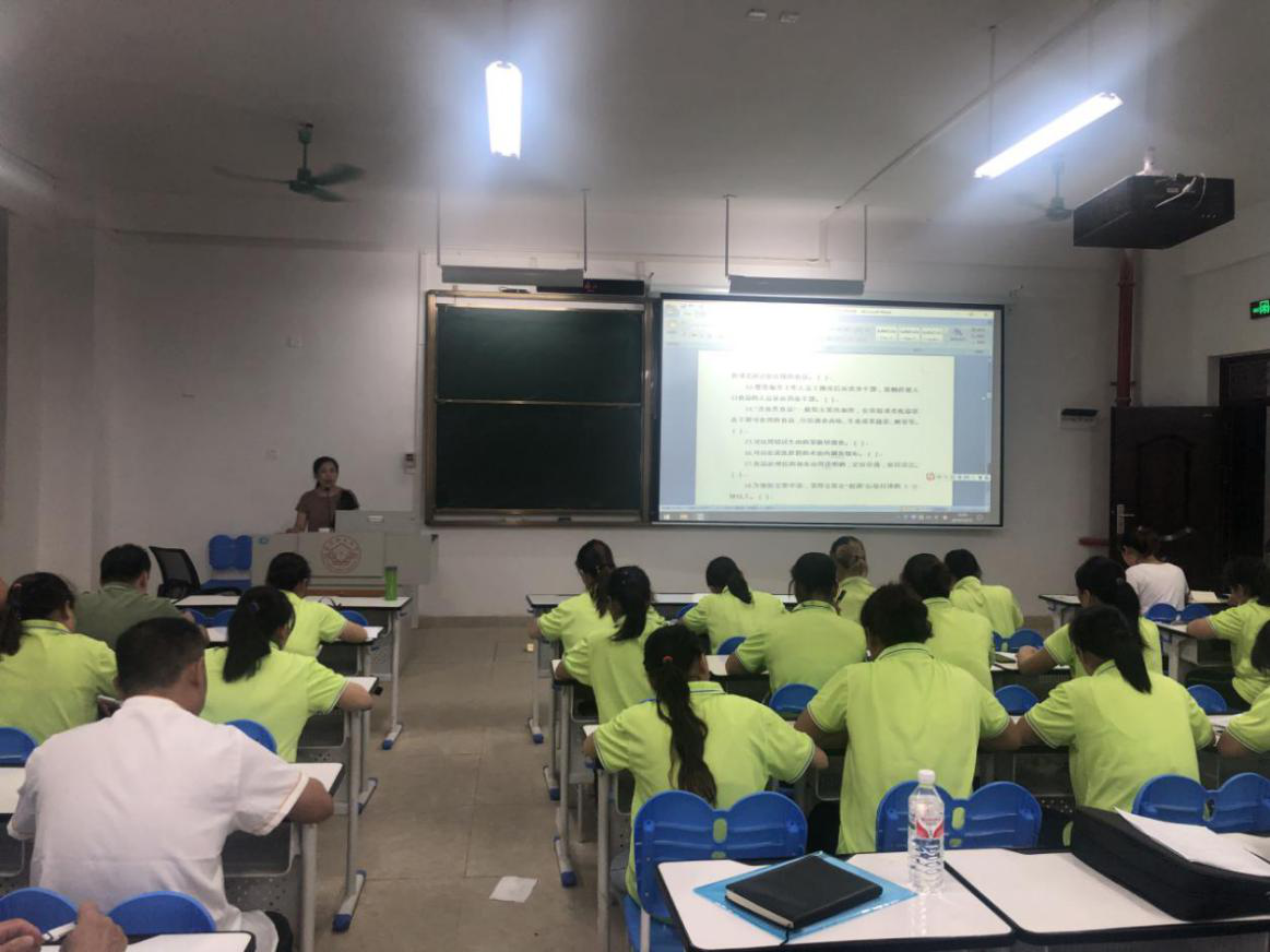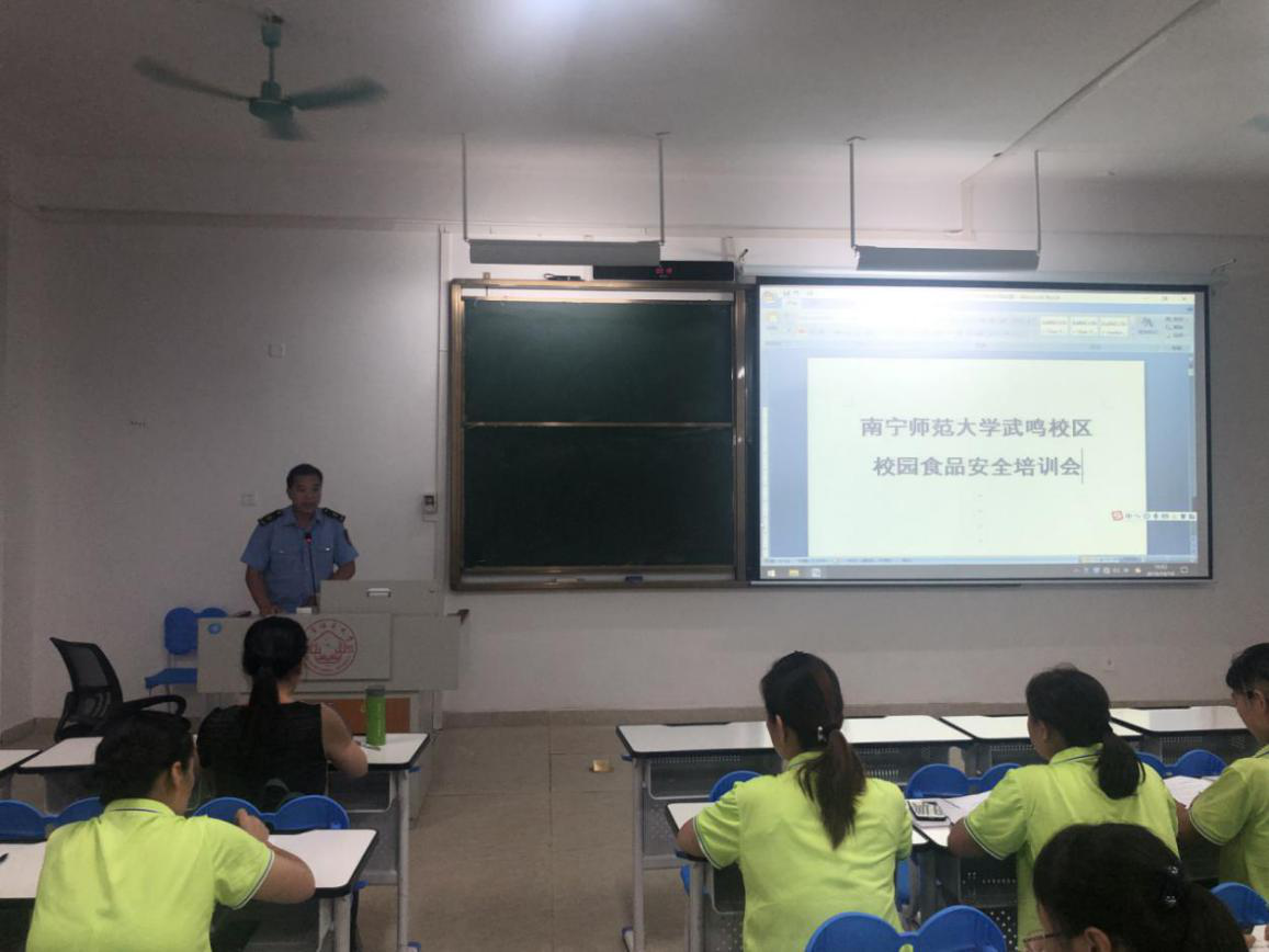 10月10日晚上七点半,武鸣区市场监督管理局餐饮股教育园区所熊绍永所长一行受邀前来我校武鸣校区,对武鸣食堂全体员工进行校园食品安全相关知识培训。培训会上,熊所长从员工进入食堂后的更衣顺序、佩戴帽子的重要性、紫外线消毒灯的作用、验收物资的注意事项、菜品留样等全方位进行了培训,要求日常的操作必须按照相关的规定进行。