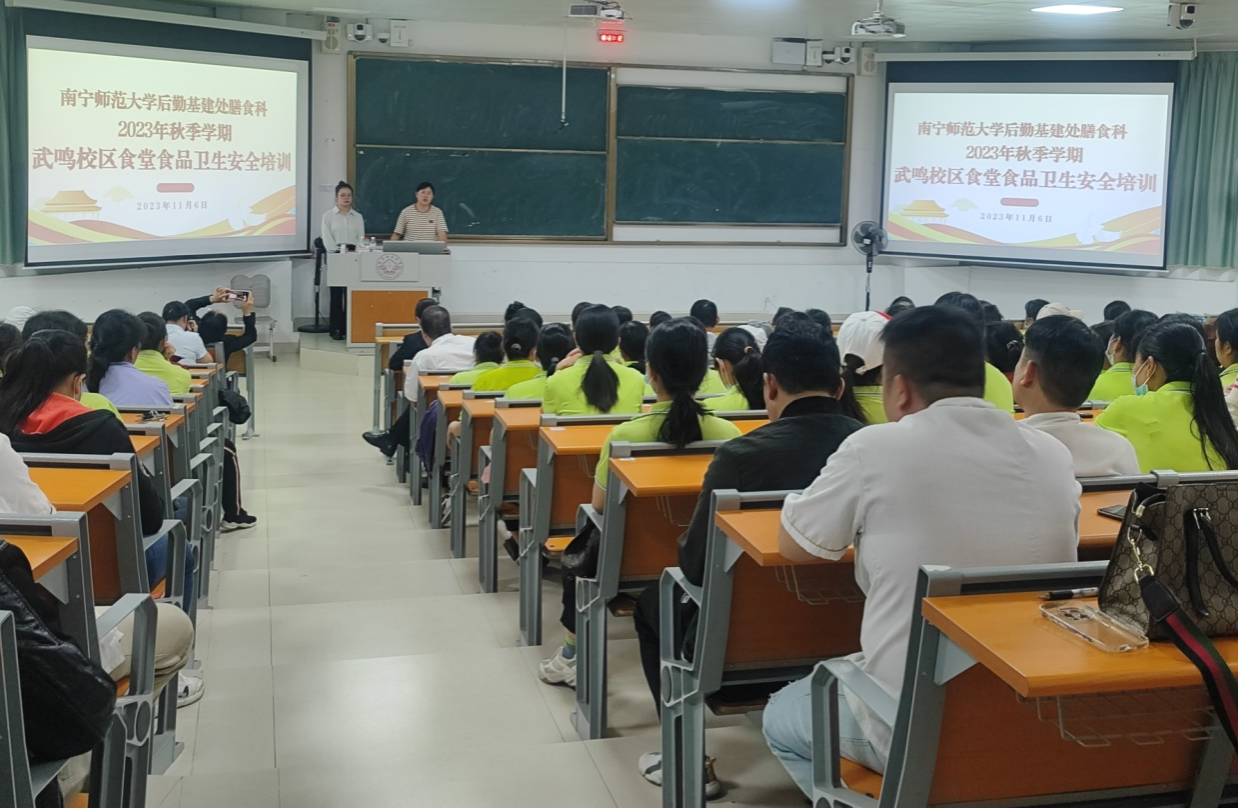 为了进一步加强校园食品卫生安全工作,切实保障广大师生饮食安全,膳食科于11月6日、7日、8日晚上,分别在武鸣、明秀、五合校区召开《食品安全管控与主体责任落实》的专项培训,参会人员有膳食科公共管理人员、食堂班组人员、天天向上餐饮公司人员等共336人。本次邀请了南宁市食品药品安全管理服务协会的白老师为大家进行培训。
