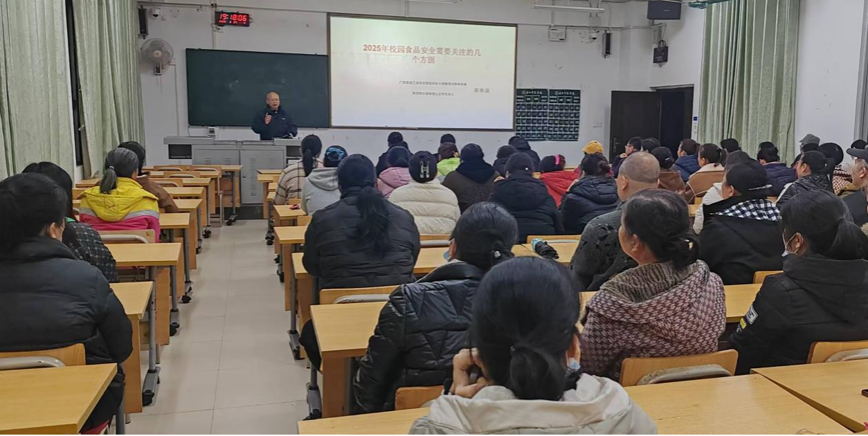 为加强校园食品安全保障,讲好“开学第一课”,2025年春季学期开学第一周,我校betway必威西汉姆联官网邀请南宁市食品安全社会监督员梁老师为食堂从业人员开展专项培训。培训分别在明秀、五合、武鸣三个校区进行,共培训从业人员344人。